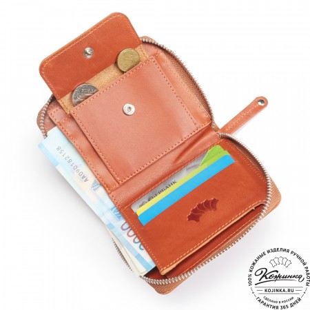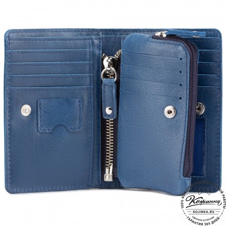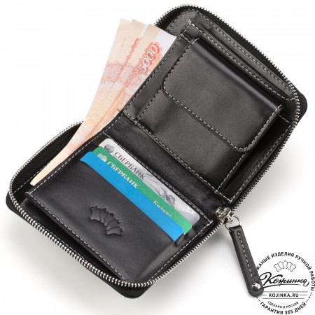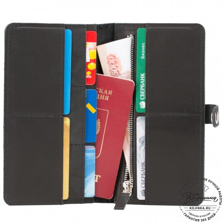 Эта модель очень функциональна - множество отделений позволяет удобно расположить большое количество кредитных карт и купюр, а также водительское удостоверение. Дополнительный отсек для мелочи. Портмоне закрывается на язычок с кнопкой.