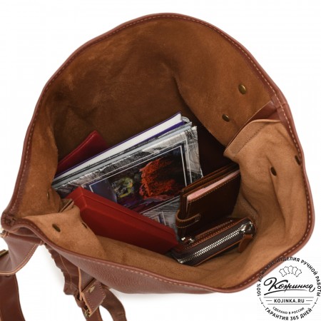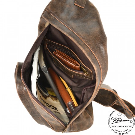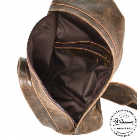 Внутри одно вместительное отделение, открывается молнией с лицевой стороны. Есть небольшой карман на задней стороне - для мелких вещей, документов. Крепкая надёжная настраиваемая конструкция на одно плечо владельца. Сверху крепкая кожаная ручка.