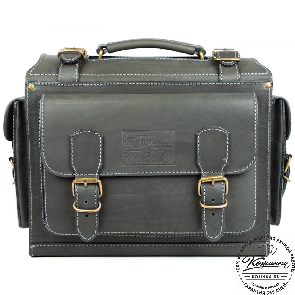 Удобная крепкая кожаная ручка и кожаный ремень с наплечником. Ремень съемный, регулируется по длине.