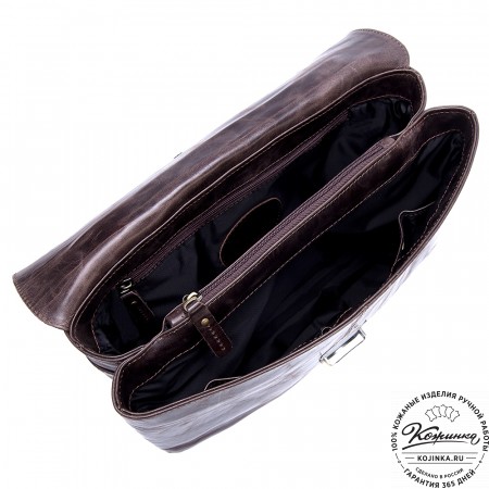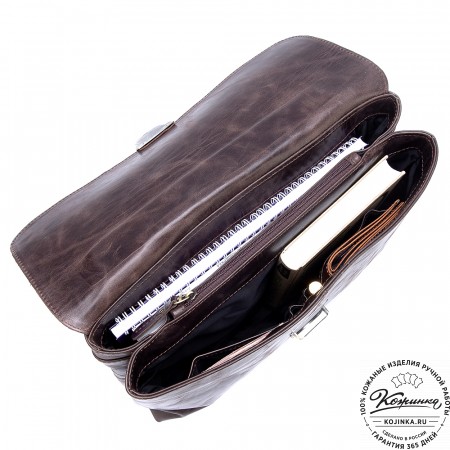 Сверху портфель закрывается клапаном на оригинальную металлическую застежку и кожаный хлястик.