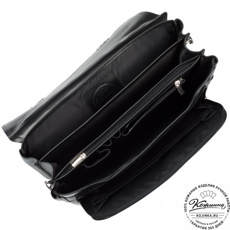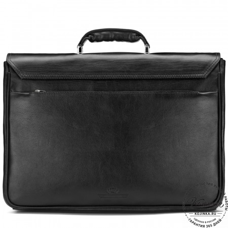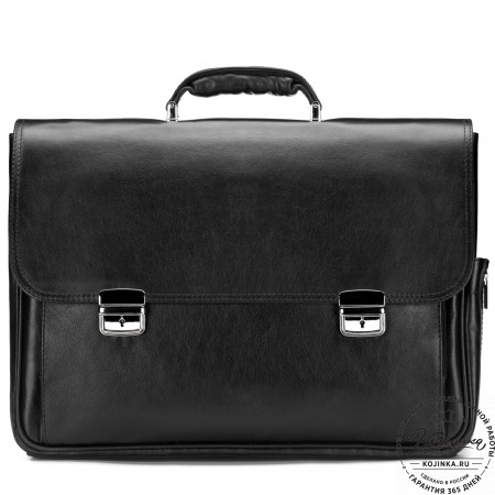 Портфель закрывается клапаном с двумя ременными застежками, под которыми спрятаны удобные портфельные замки.
