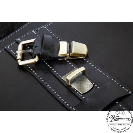 Портфель закрывается клапаном на два портфельных замка, спрятанных под ременными пряжками.