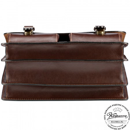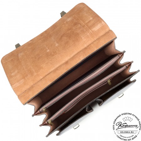 Портфель из 100% натуральной толстой кожи, закрывается на удобные классические пряжки. Внутри 2 удобных отдела разделённых перегородкой пополам. В перегородке имеется карман на молнии и удобные кожаные кармашки для ручек и мелких вещей. На передней стенке имеется два накладных кожаных кармана.