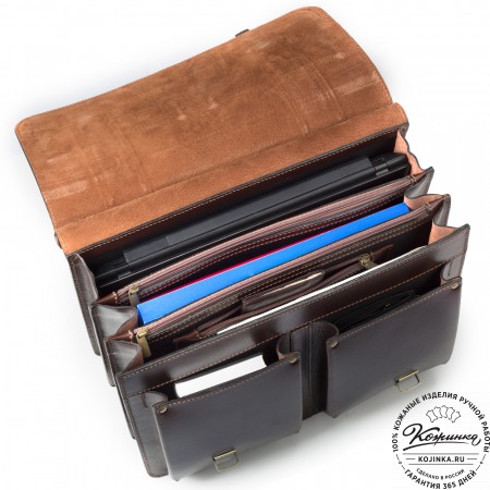 Эта вместительная модель портфеля на 3 отделения и еще 2 отделения между отделами на молнии для бумаг. Внутри имеются отделения для телефона, ручек и визиток.