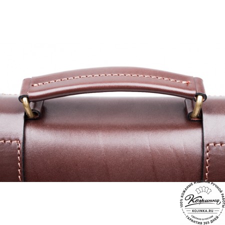 У портфеля прочная анатомическая ручка и съемный плечевой ремень из кожи, который крепится по бокам ременными пряжками.