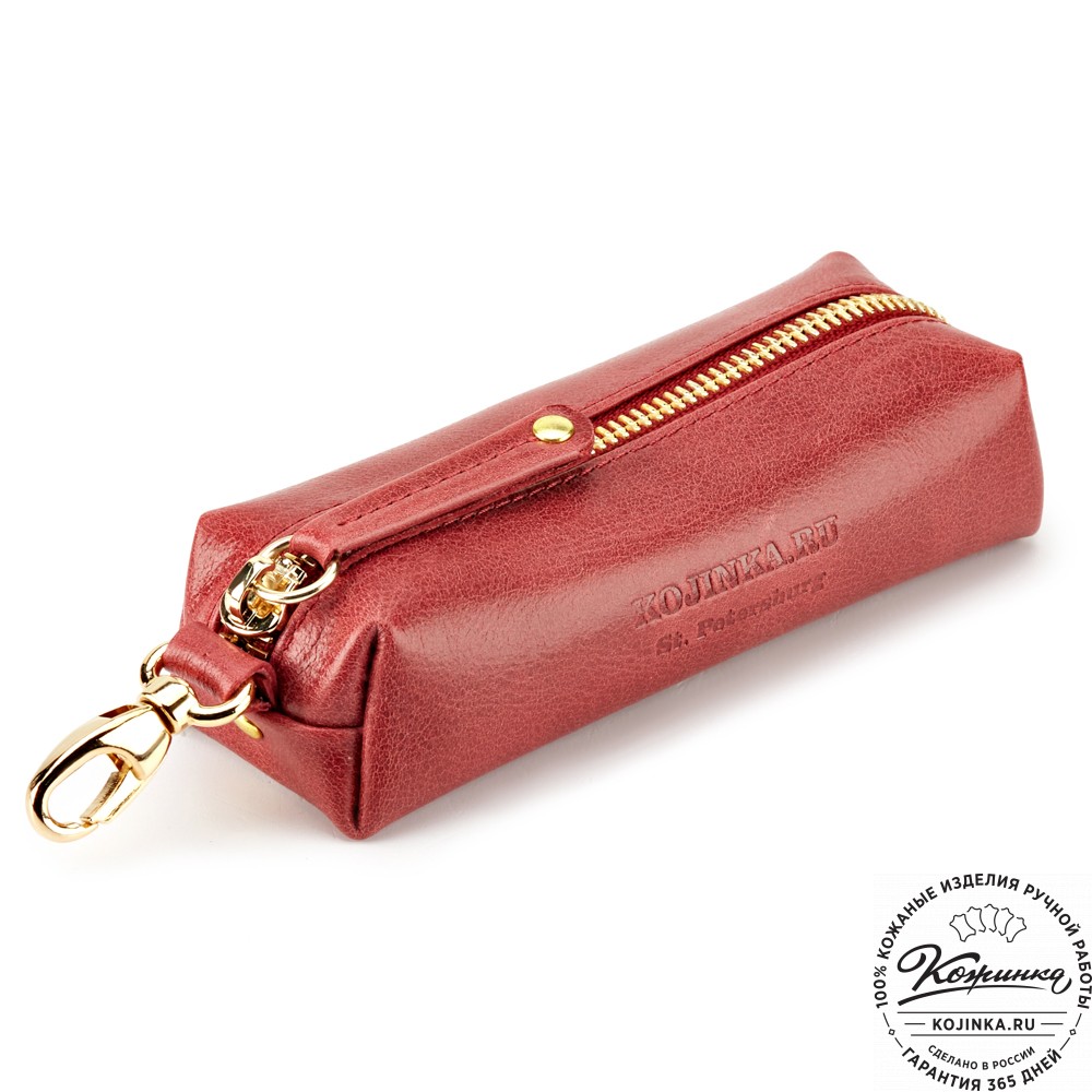 Ключница на молнии, внутри кольцо для ключей, снаружи небольшой карабин. У молнии длинный удобный пуллер из кожи.